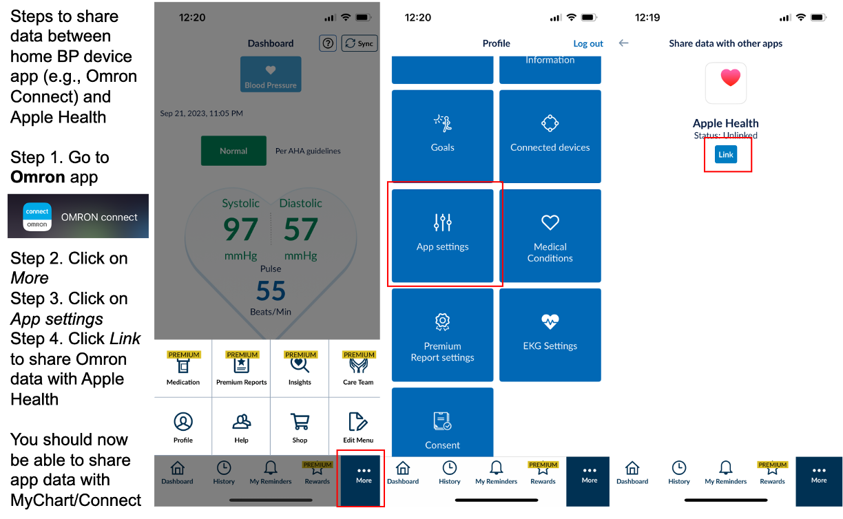 First share the data from your wireless blood pressure device app (e.g., Omron Connect) with the Apple Health app for iPhone users or Health Connect app for Android phone users. See below.